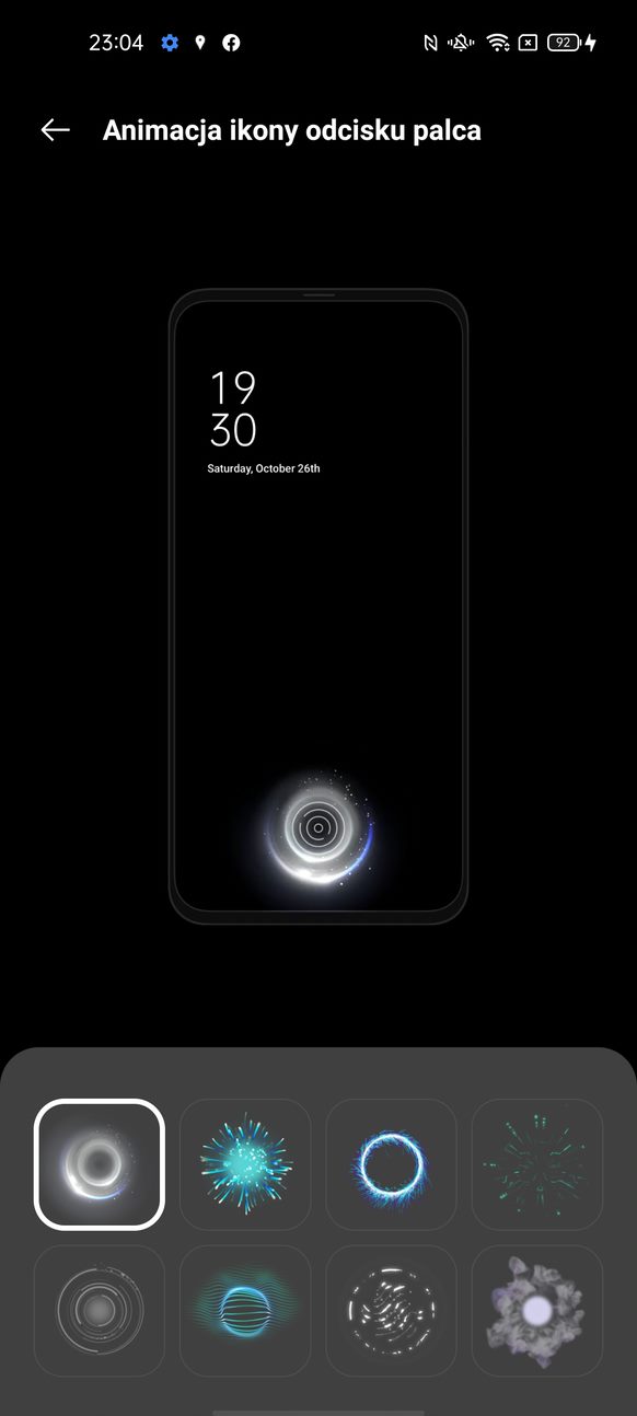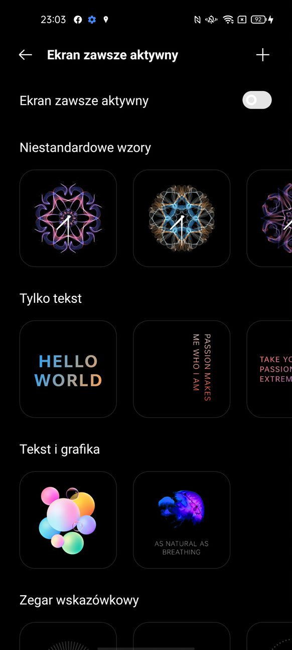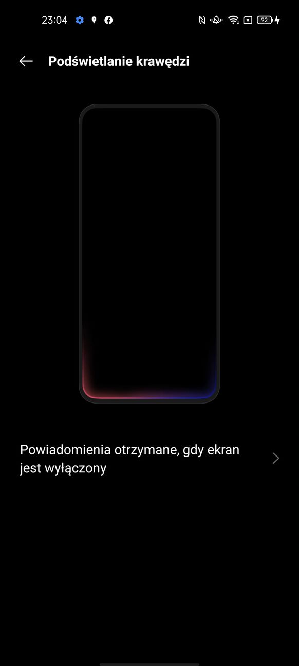 Telefon nie posiada diody powiadomień, ale ma za to opcję zwaną „ekran zawsze aktywny”, w którym możemy ustawić sobie jeden z wielu wbudowanych zegarów i co najważniejsze pojawiają się na nim notyfikacje z wszystkich aplikacji.