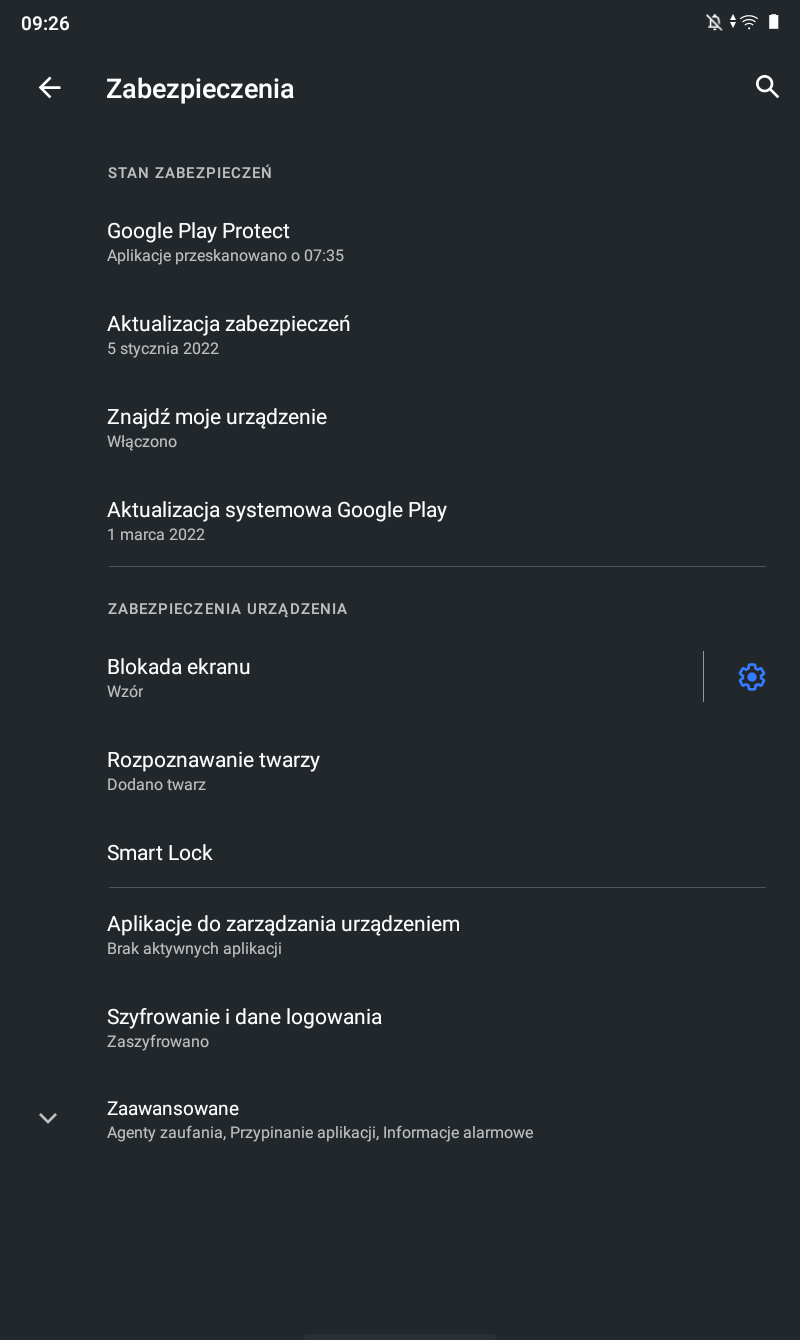 - Ochrona prywatności: Odblokowywanie twarzą, odblokowywanie hasła, odblokowywanie wzoru, Google Smart Lock