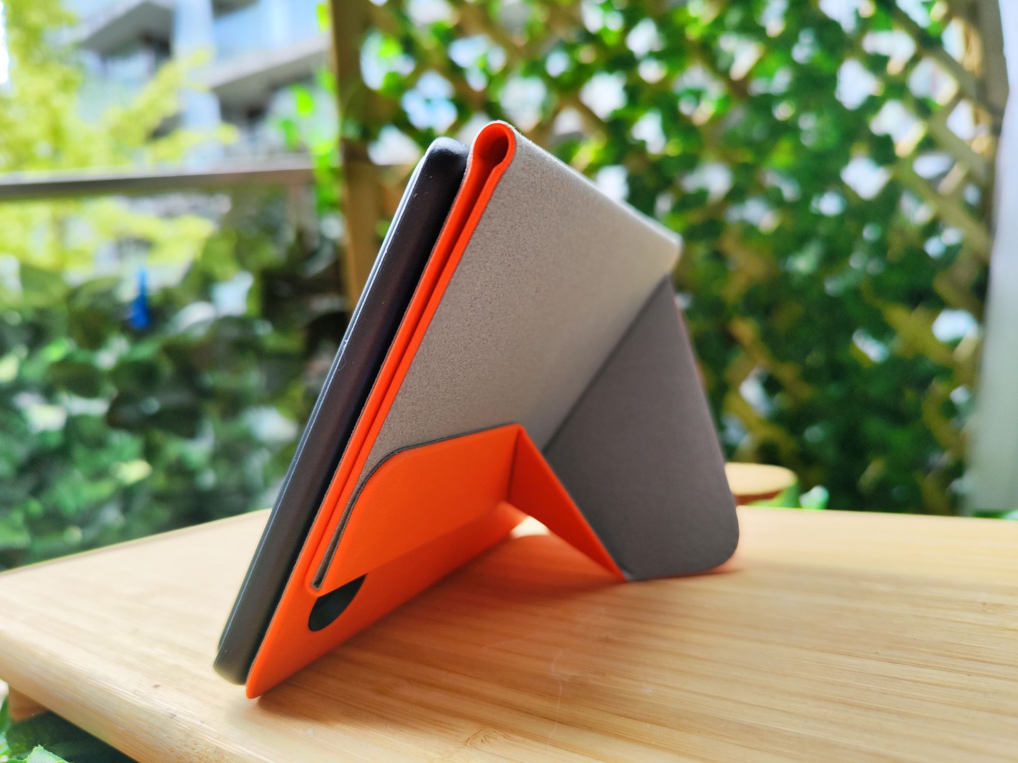 Bardzo fajnym dodatkiem jest etui, które możemy zamknąć oraz postawić na rozkładanej nóżce. Etui dostępne jest w 3 kolorach: koralowym Coral Reef Orange, zielonym Sea Glass Green i czarnym. Osobiście najbardziej podoba mi się wersja pomarańczowa i taka też trafiła w moje ręce.
