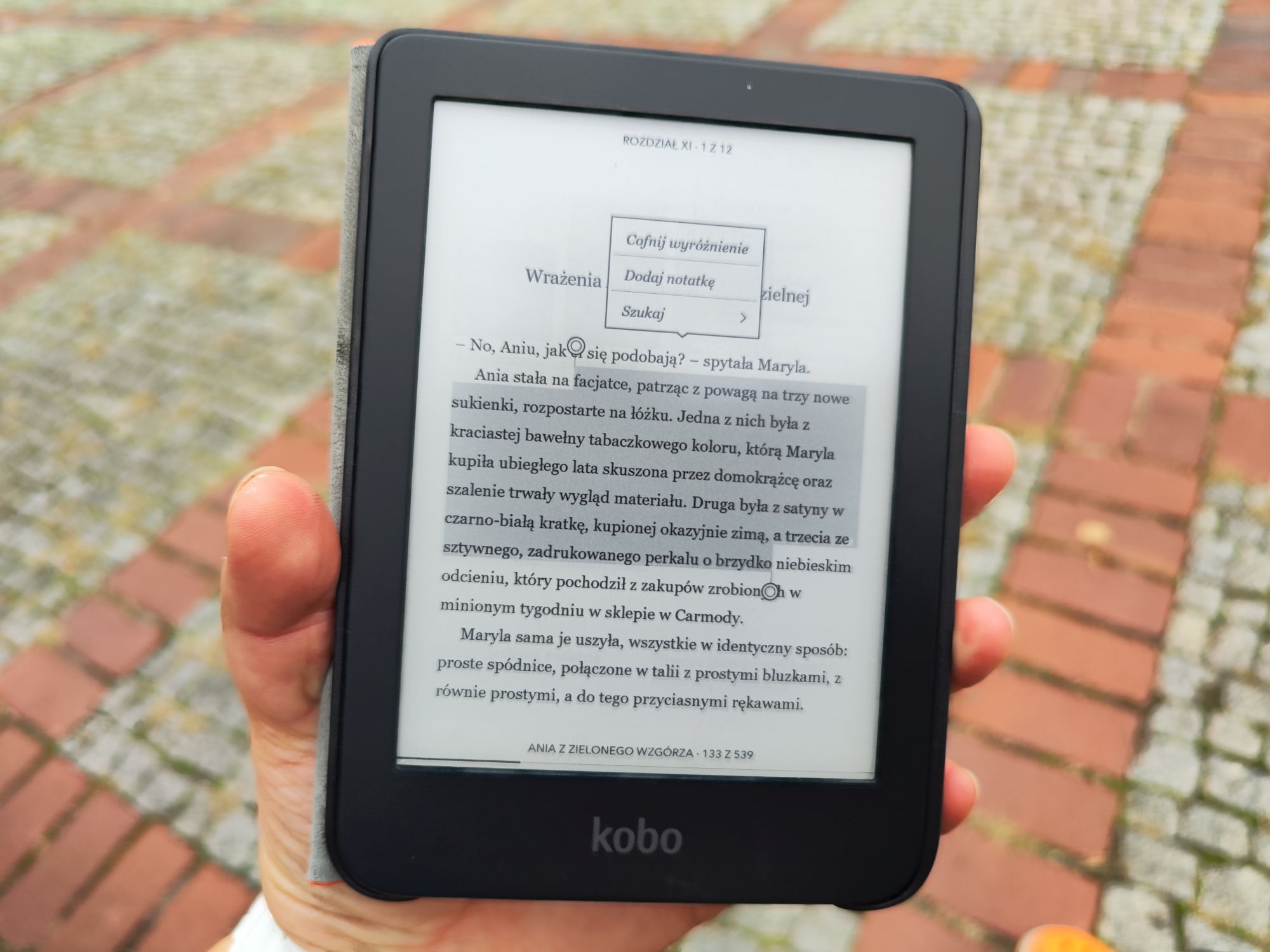 Rakuten Kobo Clara 2E na pewno zasługuje na uwagę ze względu na proces wytwórczy jaki jest wykorzystywany podczas jego powstawania – mowa tutaj o recyclingu. Co więcej producent nie pozostaje w miejscu i deklaruje, że planuje przejmować ponad 200 000 plastikowych butelek rocznie zanim dotrą one do oceanów, oraz ponad milion płyt CD i DVD, które w przeciwnym razie wylądowałby na wysypiskach śmieci. I to się chwali. A samo urządzenie? Jest ładne, dobrze wykonane, niewielkie, bardzo długo trzyma na jednym ładowaniu, wodoodporne (IPX8), można odtworzyć audiobooki i bardzo przyjemnie się z niego korzysta – czyta książki. Nie jest jednak idealnie – pojawiają się błędy w tłumaczeniach, podpięci jesteśmy tylko do jednego sklepu z książkami (nie wliczając Pocket z artykułami), które nie jest jeszcze dobrze dostosowana do polskich realiów – mam wrażenie że jest jakoś mało książek po polsku, opisy są po angielsku, ceny czasami w dolarach lub euro) . Nie możemy doinstalować też innych aplikacji, a to spore ograniczenie. Tym bardziej, że cena tego urządzenia nie jest niska. Gdyby jeszcze etui było dodawane w zestawie, to jeszcze, ale …