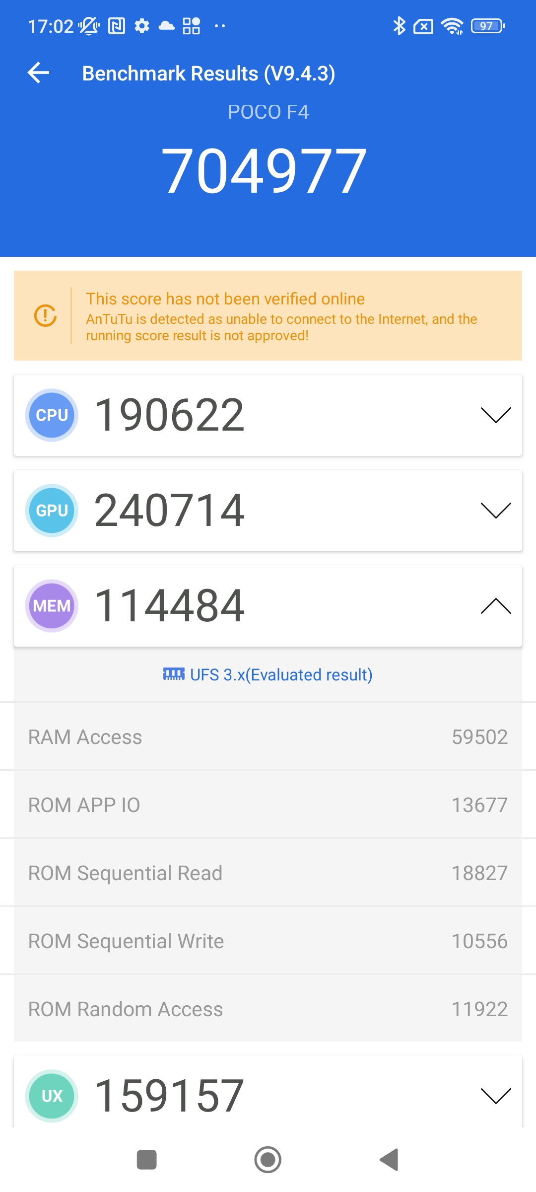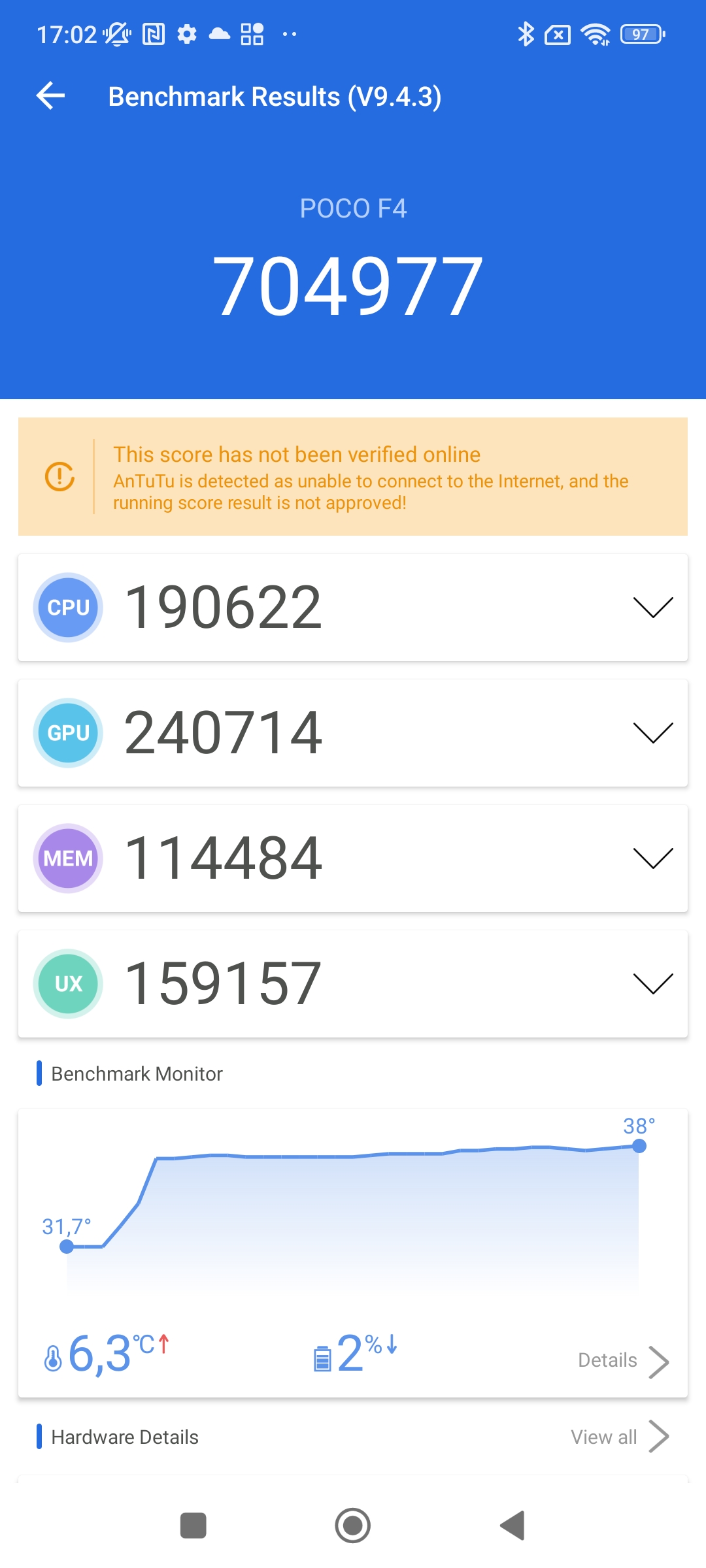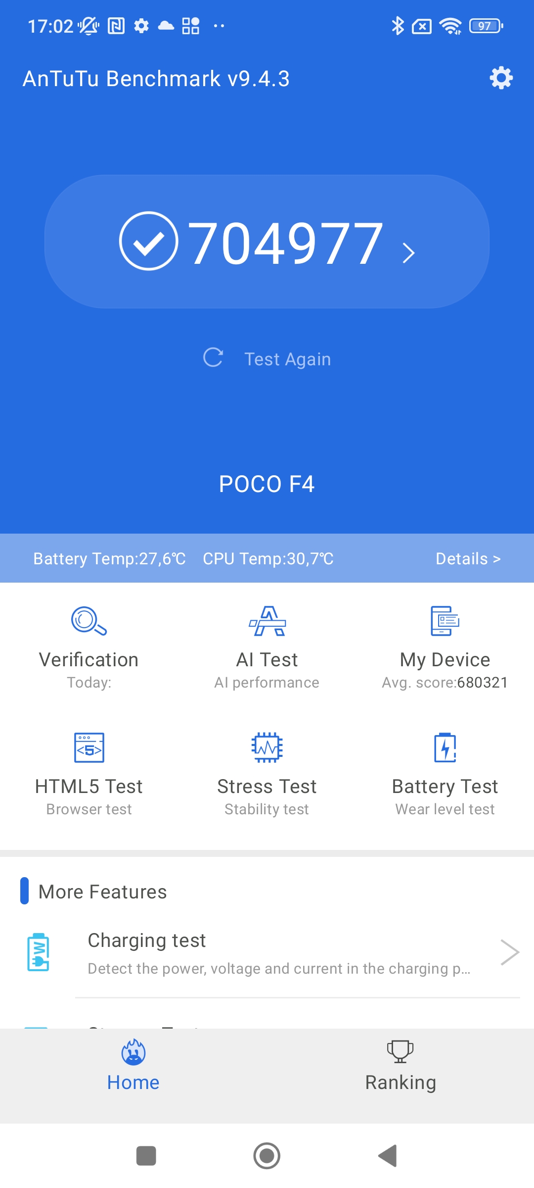 Antutu dla wersji 6/128 GB w teście wydajności pokazał wynik ponad 704 tys. punktów. U poprzednika POCO F3 podczas testu było to ok. 678 tys. punktów. Zatem nie ma tutaj jakiegoś skoku. Wynik jest bardzo zbliżony – 26 punktów, to praktycznie żadna różnica.