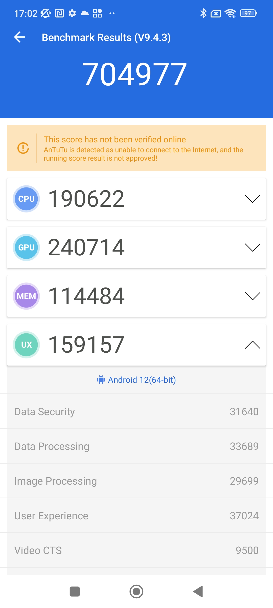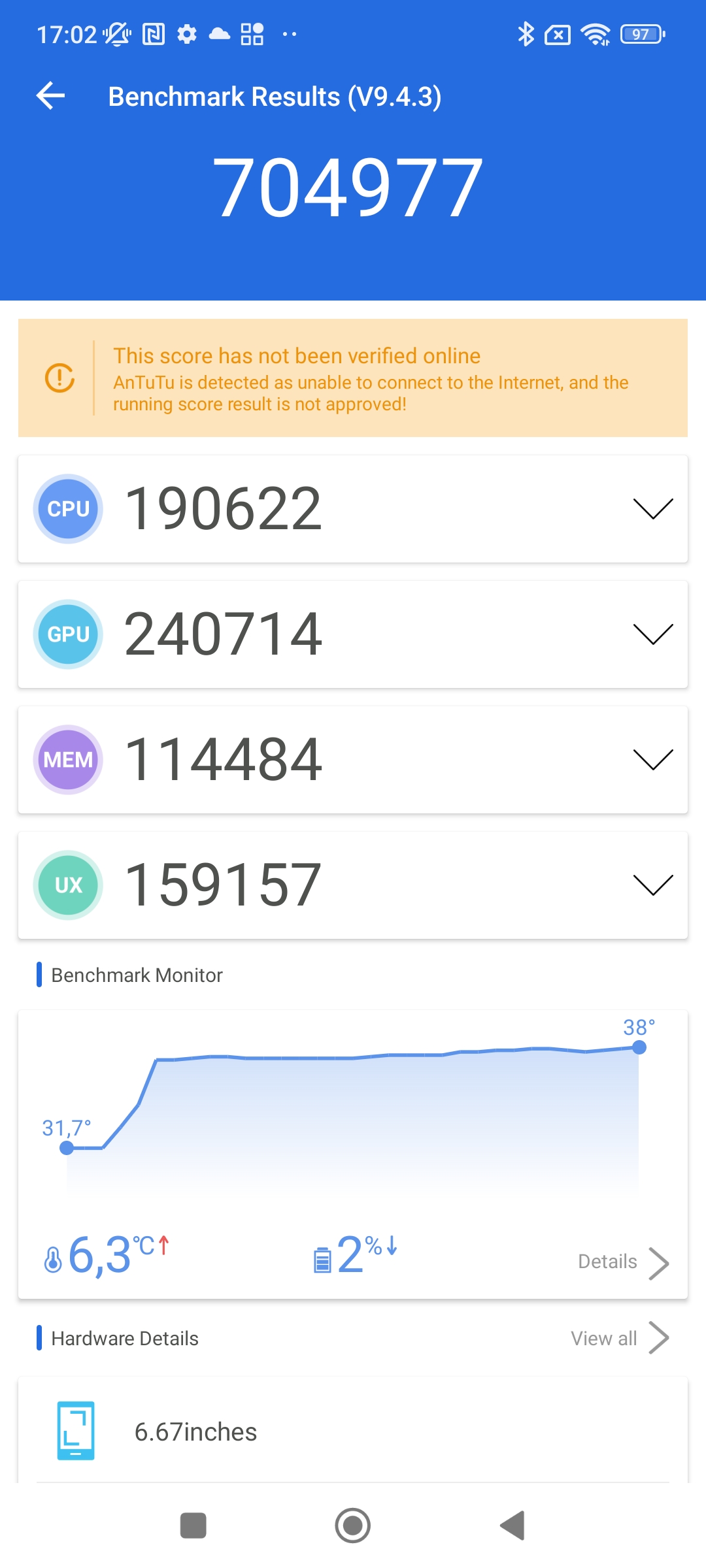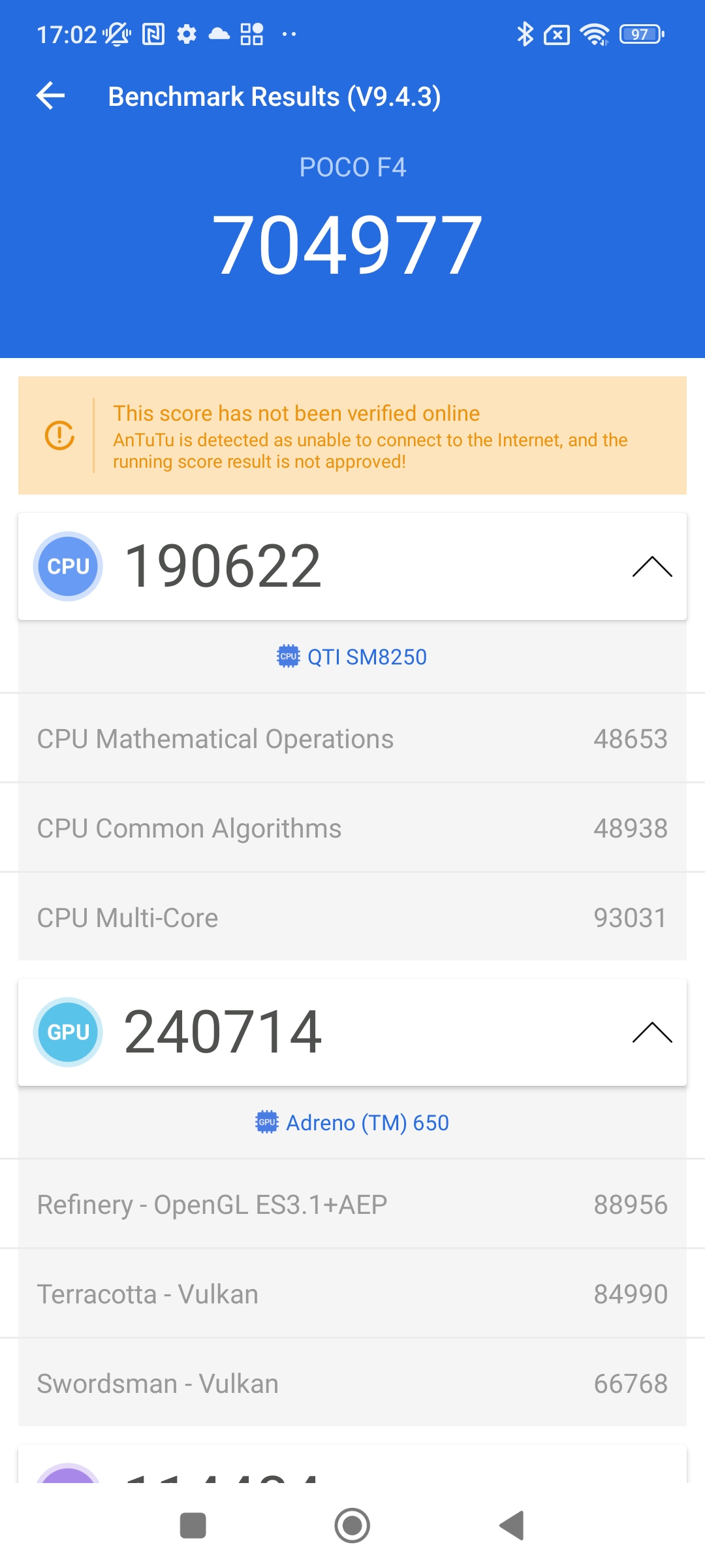 Antutu dla wersji 6/128 GB w teście wydajności pokazał wynik ponad 704 tys. punktów. U poprzednika POCO F3 podczas testu było to ok. 678 tys. punktów. Zatem nie ma tutaj jakiegoś skoku. Wynik jest bardzo zbliżony – 26 punktów, to praktycznie żadna różnica.