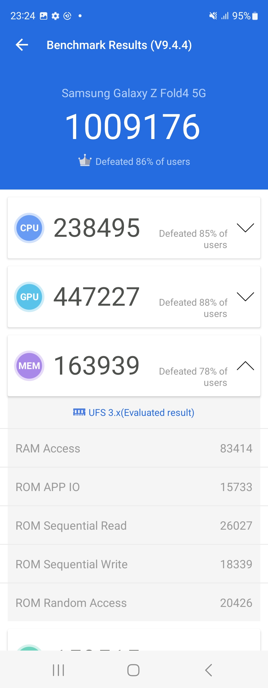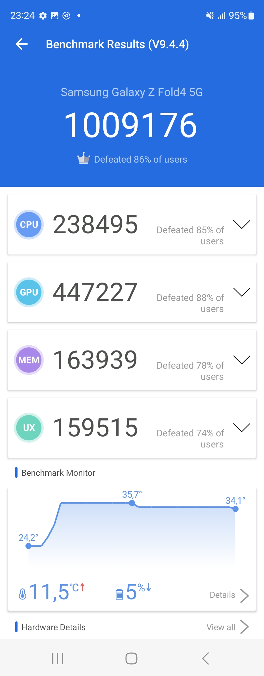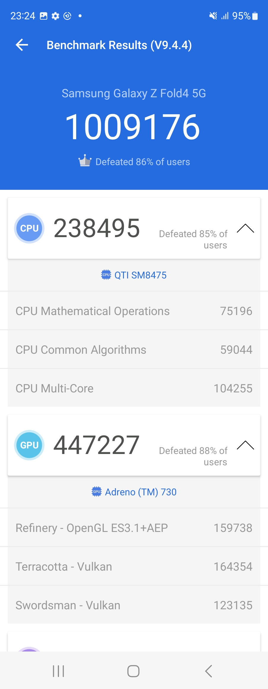 • Ekran wewnętrzny w Galaxy Z Fold 4, to 7,6’’ Dynamic AMOLED 2X Infiniti Flex (2208×1768) z płynnym odświeżaniem na poziomie 120 Hz (od 1 do 120 Hz, w poprzedniku było to od 10 do 120 Hz) oraz jasnością do 1000 nitów (w poprzedniku było to 900 nitów)