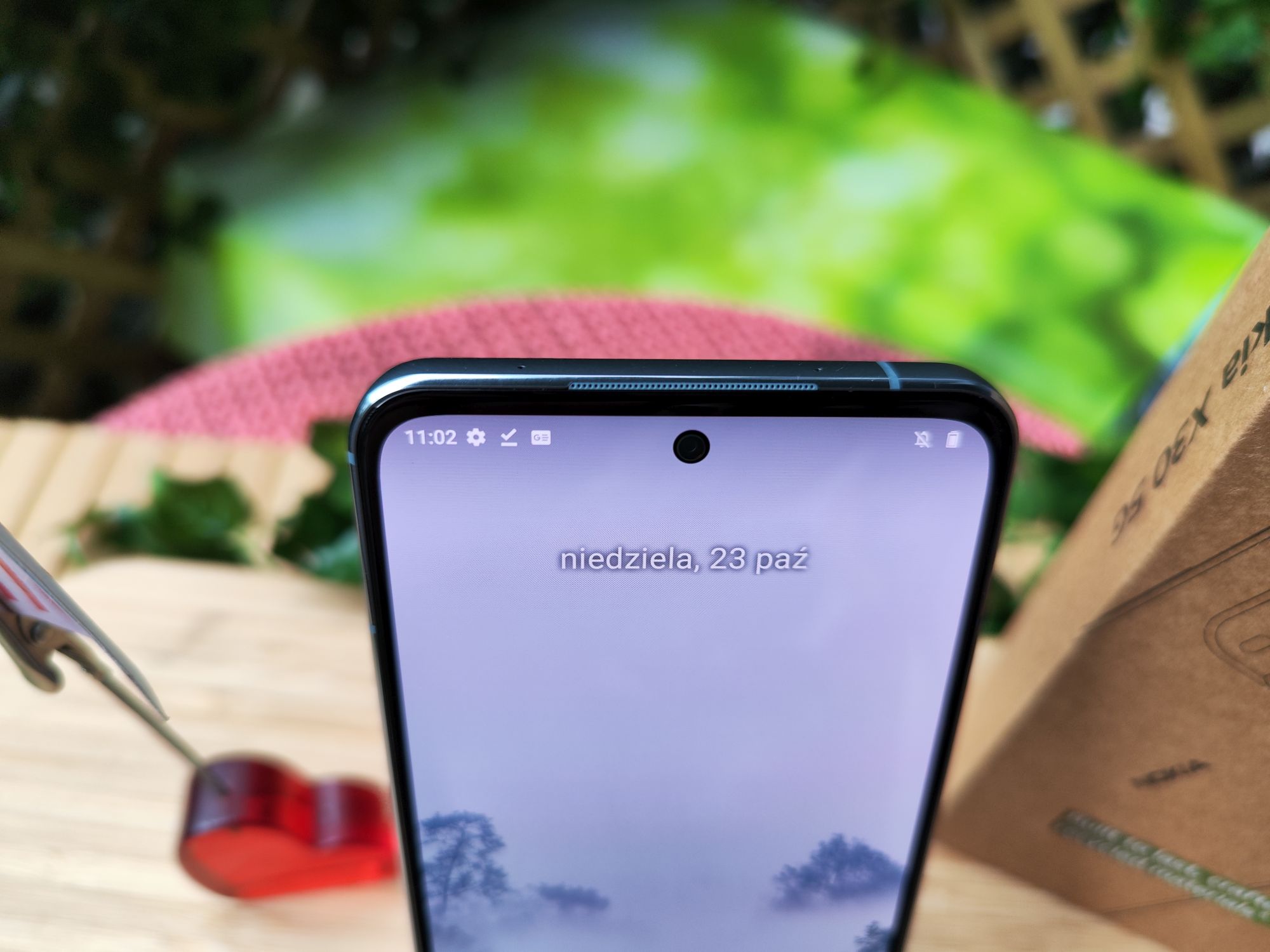 Nokia X30 5G została wyposażona płaski wyświetlacz AMOLED 6.43’’ o rozdzielczości Full HD+ 2400 x 1080, odświeżaniem adaptacyjnym do 90 Hz oraz jasnością maksymalną 700 nitów z aparatem (16 Mpix) umieszczonym w niewielkim okrągłym wcięciu na środku przy górnej krawędzi. Na górnej krawędzi umiejscowiono również głośnik do rozmów. Ramki wokół ekranu są stosunkowo wąskie z delikatnie szerszą dolną belką. Nie znajdziemy tutaj też diody powiadomień, ale jest funkcja AoD (data, godzina, pogoda itp.). Opcję to znajdziemy w konfiguracji wyświetlacza pod nazwą: „Zawsze pokazuj dane”