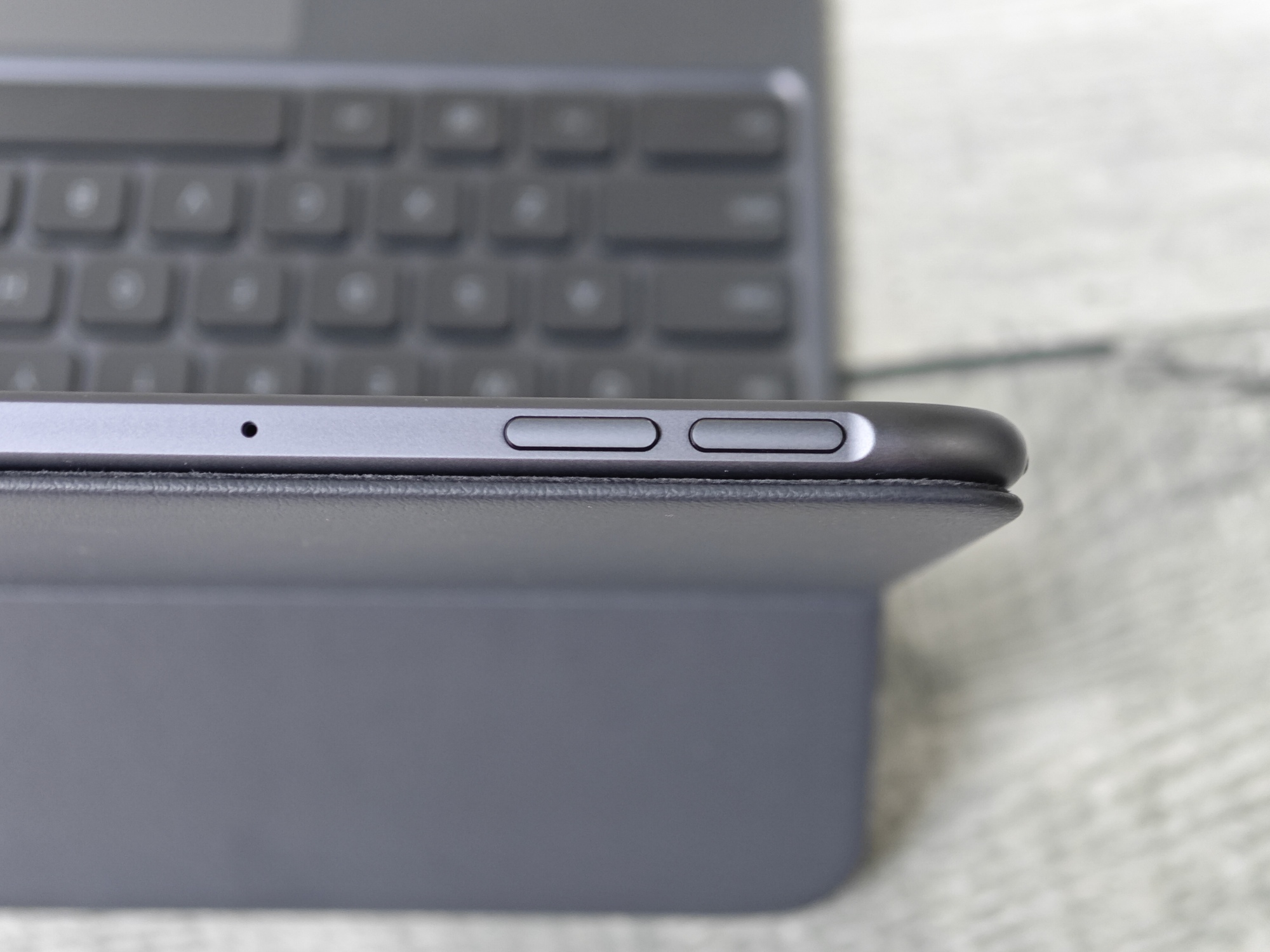 - Na lewej krawędzi (trzymając tablet poziomo): 2 głośniki z 4, włącznik/wyłącznik