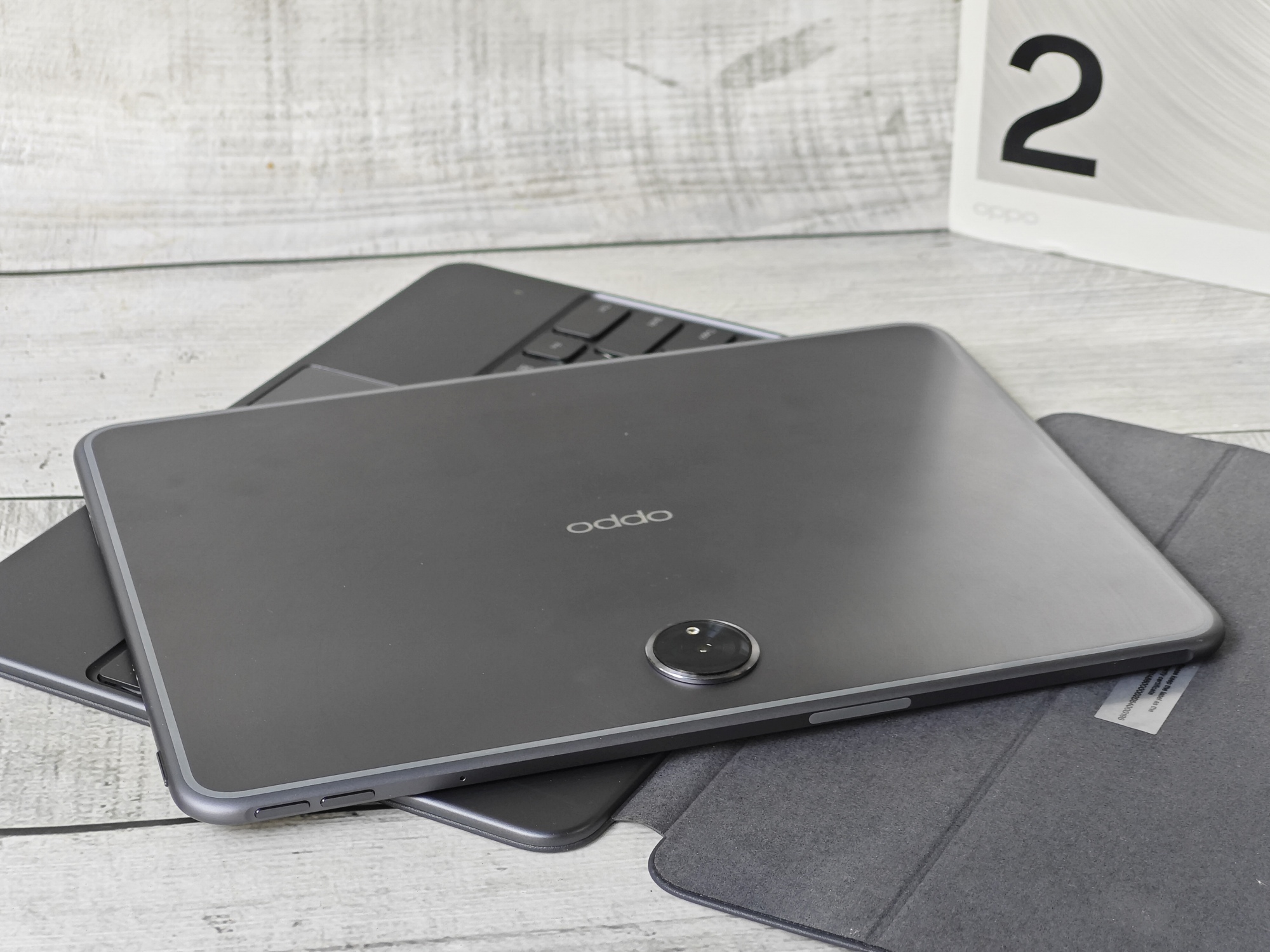 Oppo Pad 2 jest dosyć sporym tabletem (11,61 cala, proporcje 7:5), ale z drugiej strony też bardzo smukłym. Jego wymiary to 258,03 mm x 189,39 mm x 6,54 mm, a waga od ok. 552 g. Tył wykonany jest z aluminium wypolerowanym w kształcie fragmentu okręgu zaczynającego się wokół aparatów (okrągła wyspa). Wygląda to bardzo elegancko, a jednocześnie mniej się palcuje. Ramka wokoło jest delikatnie zaokrąglona, a na przodzie znajdziemy płaski ekran LCD z zaokrąglonymi rogami i aparatem do selfie umieszczonym na górnej belce (jak ustawimy tablet w poziomie).