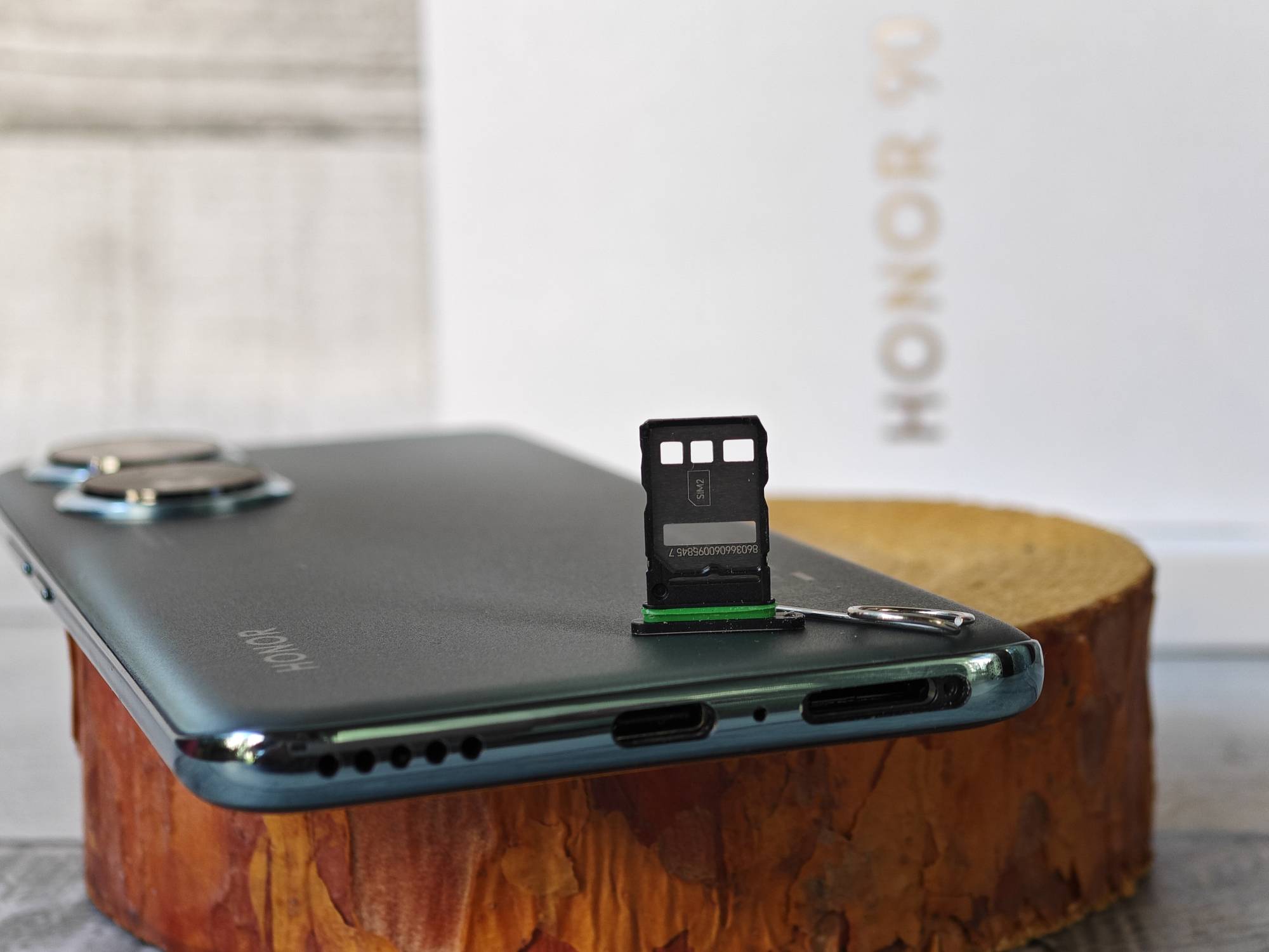 Design Honor 90 nie wyróżnia się niczym szczególnym. Znajdziemy w nim płaskie plecki z matowym rozświetlonym wykończeniem w kolorze zielonym (na słońcu wygląda jak niebieski) lub gładkim czarnym, lekko zaokrąglone cienkie ramki (plastikowe) na bokach i wyświetlacz z zaokrąglonymi bokami z wszystkich 4 stron. Aparaty na tyle umieszczono w dwóch oddzielnych okrągłych wysepkach. Jedna pod drugą. Standardowo też wystają i warto od razu zaopatrzyć się w etui. Szkoda, że nie znalazłam go w opakowaniu. Obudowa nie posiada żadnej ochrony przed wodą czy pyłem. Przynajmniej nie certyfikowaną, możemy odnaleźć np. uszczelnienie na szufladce z kartą SIM. Poza tym prezentuje się OK.