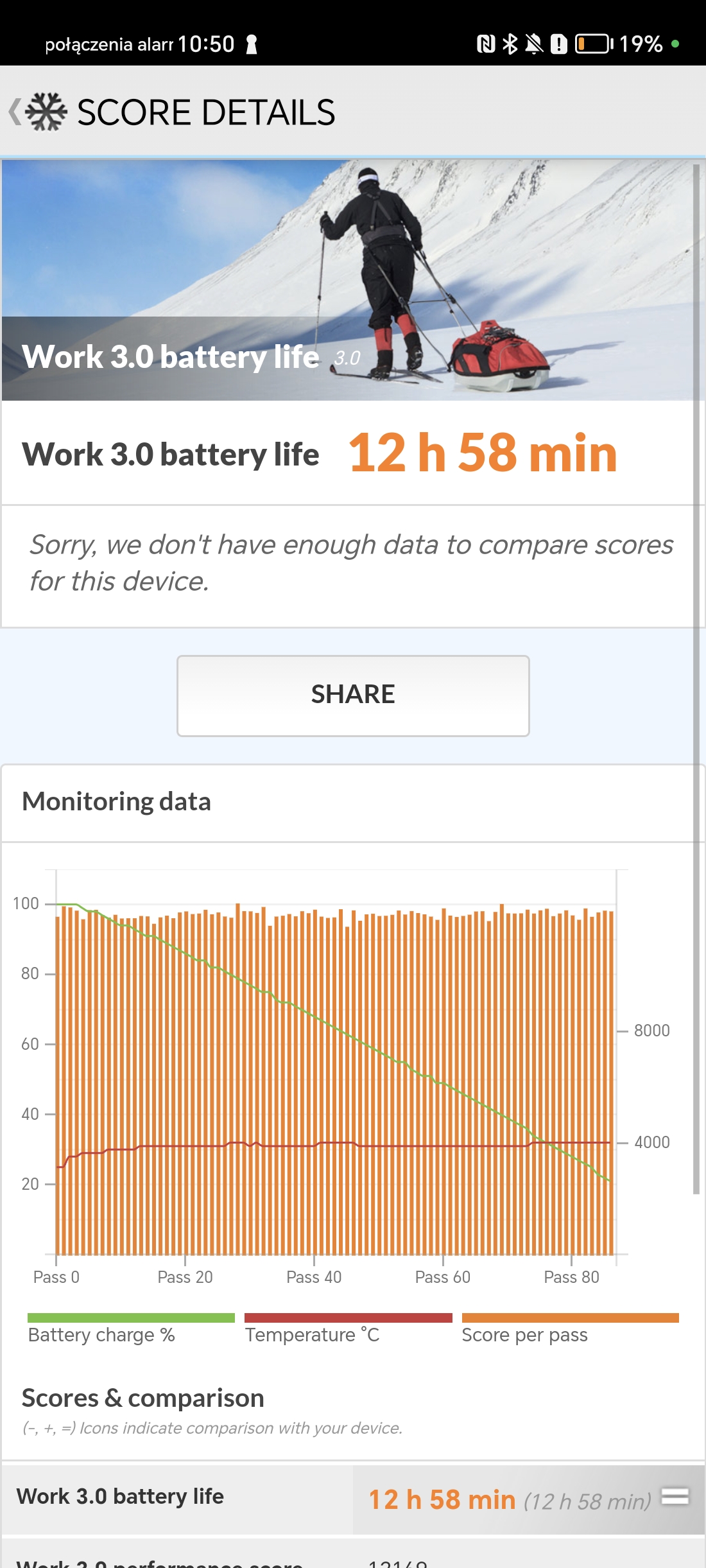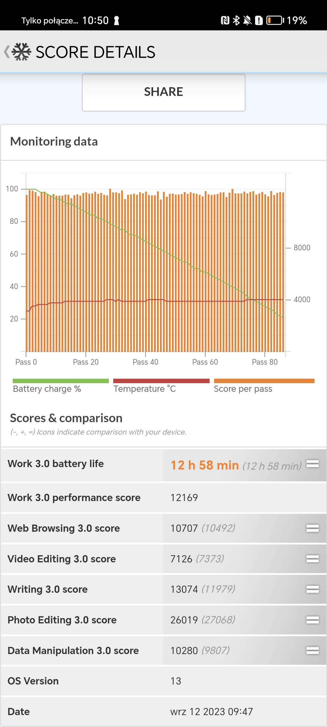 Honor 90 wyposażono w baterię o pojemności 5000 mAh (wartość typowa), która bez problemu starcza na cały dzień intensywnej pracy i ok. 1,5 dnia mniej intensywnego użytkowania. Jak smartfon służy tylko do dzwonienia i sporadycznego spojrzenia na media społecznościowe czy wysłania SMS-a, to możemy szukać ładowarki nawet po 2,5 – 3 dniach. Przy teście z PC Mark bateria ze 100% do 20% rozładowała się po ponad 13h. Zatem i tutaj. Generalnie jeśli chodzi o czas pracy, to nie ma tutaj jakiegoś odskoku od aktualnych smartfonów.