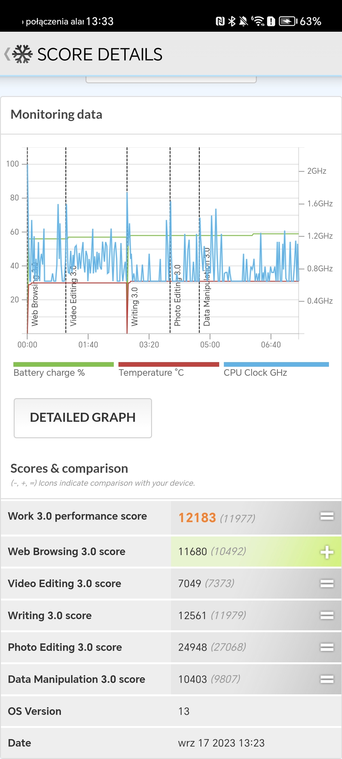 Z procesorem Snapdragon 7 Gen 1 spotkaliśmy się już przy Xiaomi 13 lite. Układ ten miał już dosyć dawno swoją premierę, a dopiero od jakiegoś czasu pojawił się w smartfonach. W klasycznym, codziennym użytkowaniu nie ma też większych powodów do narzekań, ale jest to tylko średniopółkowa jakość. Przy większym obciążeniu widać spadek mocy (Throttling jest zauważalny). Gdy nie męczymy smartfonu zbyt dużą ilością wymagających aplikacji (używałam głównie media społecznościowe czy przeglądarkę, pocztę, proste gry), to wszystko odziała wystarczająco płynnie. Nie zauważyłam też, aby smartfon się jakoś nadmiernie przegrzewał. Przynajmniej w takim codziennym użytkowaniu. Wiadomo, ze jak damy mu porządnie popalić, to plecki mogą stać się nieco cieplejsze, a i wspomniana wydajność zacznie również spadać. W benchmarku AnTuTu telefon uzyskał ponad 695 tys. punktów. Model ten obsługuje również łączność 5G.