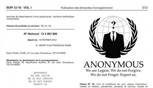 Jedna z francuskich firm Early Flicker, zarejestrowała logo i slogan hakerskiej grupy Anonymus by wykorzystać je do celów komercyjnych. Chodzi tu o bezgłowy wizerunek postaci stojącej w garniturze, nad którą unosi się znak zapytania. Podobnie stało się z hasłem „Jesteśmy Anonimowi. Jesteśmy legionem. Nie wybaczamy. Nie zapominamy. Spodziewajcie się nas”, które stało się teraz własnością intelektualną Early Flicker i ma trafić na koszulki, kubki i inne przedmioty sprzedawane przez firmę.