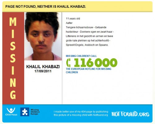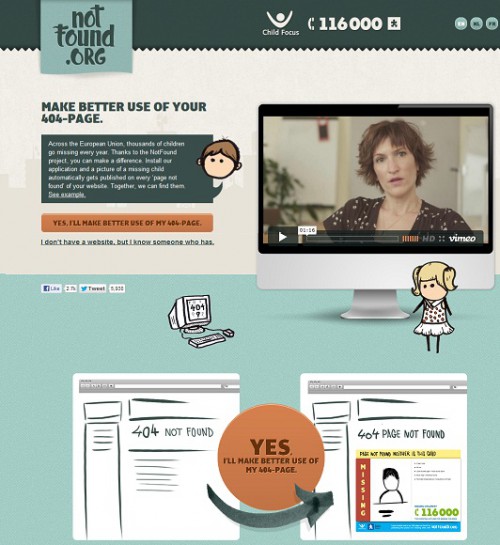 Organizacja NotFound.com zajmuje się modyfikowaniem stron z błędem 404, tak aby na nich pojawiały się informacje oraz zdjęcia zaginionych osób, a w szczególności dzieci.