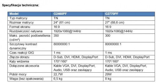 Przewidywane ceny detaliczne brutto monitorów AOC G2460PF oraz G2770PF to kolejno 1329 oraz 1659 PLN.