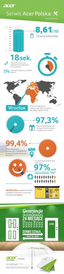 Badania opinii klientów serwisu Acer, prowadzone przez zewnętrzną firmę, pozwalają monitorować poziom satysfakcji klientów. Badanie przeprowadzone w maju 2016 roku pokazuje, że 97,3% napraw zostało wykonanych w ciągu mniej niż pięciu dni roboczych. W maju został także obniżony średni czas oczekiwania na połączenie z konsultantem z 27 sekund do 18. Krótki okres oczekiwania został uzyskany przez wdrożenie dodatkowych sposobów kontaktu z serwisem: za pomocą czatu, maila oraz samodzielnego zgłaszania produktu do naprawy.
