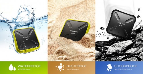 Obudowa pamięci ADATA SD700 spełnia wymogi normy IP68, co oznacza odporność na zanurzenie w wodzie do głębokości 1,5 metra przez 60 minut oraz całkowitą pyłoszczelność. Dodatkowa wojskowa norma MIL-STD-810G 516.6 gwarantuje odporność na wstrząsy, uderzenia i upadki. Dysk waży tylko 100 g i ma wymiary 83,5 x 83,5 x 13,9 mm.