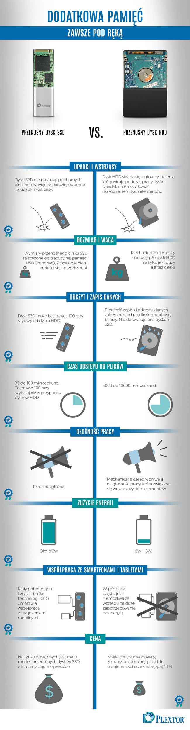 Dyski SSD to zdecydowani liderzy w tej kategorii. Pozwalają na osiągnięcie prędkości zapisu i odczytu na poziomie 500 MB/s. Oznacza to, że plik o rozmiarze 5 GB zostanie skopiowany w zaledwie 16 sekund. – czyli ponad 4 razy szybciej, niż w przypadku zewnętrznego dysku HDD. Istotnym parametrem jest również czas dostępu do plików, czyli okres pomiędzy wysłaniem żądania a otrzymaniem odpowiedzi. W przypadku dysków HDD jest to uzależnione od części mechanicznych – głowica potrzebuje czasu, aby ustawić swoją pozycję i odnaleźć potrzebne dane na talerzach. Zazwyczaj są to wartości rzędu 12 milisekund. Dyski SSD nie posiadają ruchomych części, a więc czas dostępu zależy tylko i wyłącznie od rodzaju pamięci flash.