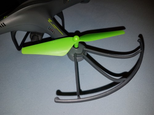 Na spodniej części drona znajdują się 2 podwozia, 4 kolorowe diody oraz kamerka 1 MP. Kamerka posiada gniazdo mikro SD na kartę pamięci. Producent dostarcza w opakowaniu kartę 4 GB. W modelu, który testowaliśmy takiej karty nie było i na czas testu została zamontowana karta 16 GB. Za kamerką znajduje się wejście na baterię, a obok kamerki włącznik drona.
