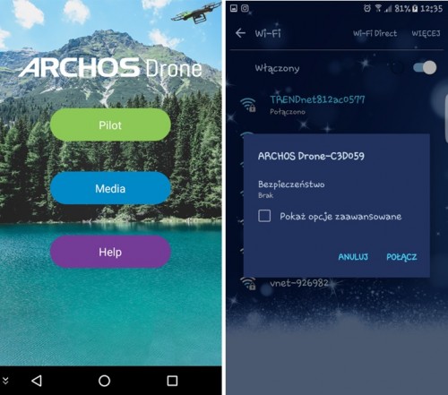 Po opanowaniu pilota zainstalowałam aplikację: ARCHOS Drone Remote Available pobraną ze sklepu Google Play ( https://play.google.com/store/apps/details?id=com.udirc.archosdroneremote&hl=pl ). Uruchomienie aplikacji i podłączenie się do spersonalizowanej sieci Wifi drona trwa zaledwie kilka minut.