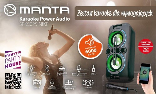 Manta wprowadza do sprzedaży nowy model przenośnego zestawu karaoke. Głośnik Manta SPK5025 NIKE to nowe urządzenie pochodzące z linii produktów Manta Party House. Umożliwia zamianę każdego domu w „Imprezowe centrum rozrywki”. To doskonałe rozwiązanie dla wszystkich, którzy lubią zabawę szczególnie przy dźwiękach ulubionej muzyki.