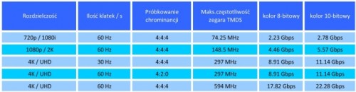 − Dlatego korzystając z interfejsów HDMI przy odtwarzaniu sygnałów z najnowszych urządzeń musimy pójść na kompromis i obniżyć próbkowanie kolorów, ilość bitów lub klatek na sekundę – twierdzi Tomasz Trzaskalski. Zagadnienie to Ilustruje poniższa tabela: