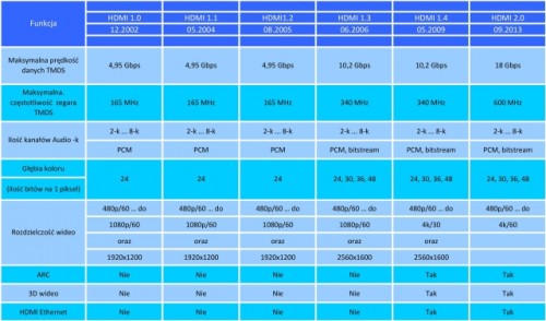 Poniższa tabela na podstawie Extron Digital Design Guide przedstawia funkcjonalność różnych złączy HDMI: