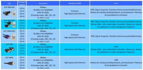 Kable certyfikowane stanowią trzy serie produktów firmy SCP – to m.in. modele SCP 990UHD (kable instalacyjne, rekomendowane do instalacji przemysłowych), SCP 991UHD (kable slim – ultra cienkie i elastyczne, sprawdzające się przy podłączeniach w trudno dostępnych miejscach) oraz ekskluzywne kable Ultra Violet SCP 990UHDV, które charakteryzują się po najwyższymi parametrami pracy oraz niestandardowym designem.