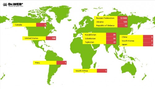 Tak wyglądające wiadomości są wysyłane do wszystkich adresatów w książce telefonicznej, przez co Android.Wormle.1.origin może zainfekować bardzo dużą ilość urządzeń w krótkim czasie, a tym samym poszerzyć znacznie sam botnet. Statystyki zebrane przez Doctor Web wskazują, że jak dotąd złośliwym oprogramowaniem zostało zainfekowanych ponad 14,000 tysięcy urządzeń, należących do użytkowników mieszkających w ponad 20 krajach. Większość z nich – 12, 946 tysięcy (91,49%) – znajduje się w Rosji, a następnie na Ukrainie (0,88%), w USA (0,76%), na Białorusi (0,51%), w Kazachstanie (0,25%), Uzbekistanie (0,21%) i Tadżykistanie (0,15 %), co obrazuje również poniższa mapa: