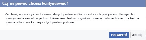 Wybranie opcji „Ogranicz widoczność starych postów” sprawi, że wszystkie twoje stare posty będą wyświetlane jedynie twoim znajomym. Po kliknięciu Facebook wyświetla nieco niepokojący komunikat, że ta zmiana jest trwała, jednak jest to jeden z najlepszych kroków jakie można podjąć, aby zabezpieczyć swoje konto.