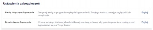 Gdy wejdziesz w panel „Kontroli prywatności” i wybierzesz opcję „Bezpieczeństwo” będziesz miał możliwość ustawienia powiadomień w przypadku logowania się na twój profil z urządzenia, z którego wcześniej nie korzystałeś. Może być to fałszywy alarm, gdy logujesz się np. na komputerze w hotelu podczas wakacji, jednak czasem może być to powiadomienie o kimś próbującym włamać się na twój profil ze swojego komputera. W obu przypadkach Facebook wyśle powiadomienie, abyś mógł podjąć niezbędne kroki do ponownego zabezpieczenia profilu. Możesz również wybrać sposób w jaki chcesz być powiadomiony o naruszeniu twojego bezpieczeństwa.
