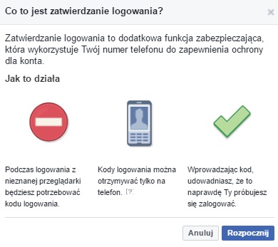 W tym miejscu należy zastanowić się, czy warto podawać swój numer telefonu na Facebooku. Wielu użytkowników robi to niechętnie, gdyż nie chce dzielić się swoimi wrażliwymi danymi. Dodając jednak swój numer zyskujesz możliwość ustawienia powiadomień, które Facebook będzie przesyłał do ciebie w postaci smsów. Możesz ustawić także opcję „Zatwierdzania logowania”, jako kolejną warstwę ochrony. Gdy włączysz tę opcję, za każdym razem gdy będziesz logował się na nieznanym urządzeniu będziesz musiał podać kod przesłany za pomocą smsa, aby kontynuować logowanie. Nie mając dostępu do twojego telefonu, osoba włamująca się na twój profil, nie będzie mogła uzyskać do niego dostępu.