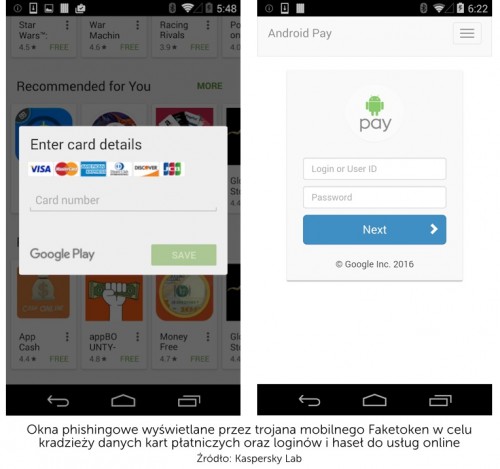 Eksperci z Kaspersky Lab wykryli modyfikację mobilnego trojana bankowego Faketoken dla Androida, która potrafi szyfrować dane użytkownika. Zmodyfikowany szkodnik, podszywający się pod różne programy i gry, w tym Adobe Flash Player, potrafi również kraść dane uwierzytelniające z ponad 2 000 aplikacji finansowych dla systemu Android. Jak dotąd zmodyfikowany Faketoken ma na swoim koncie ponad 16 000 ofiar w 27 krajach – najwięcej w Rosji, na Ukrainie, w Niemczech i Tajlandii.