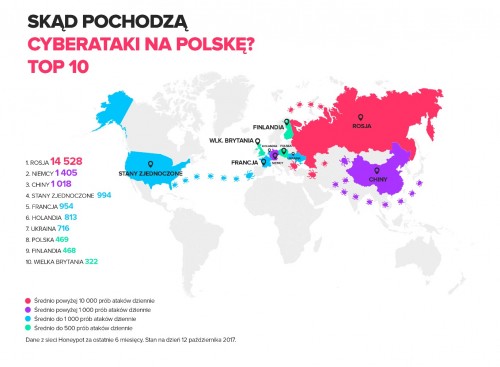 Cyberataki zdecydowanie najczęściej przeprowadzała Rosja, podejmując średnio 14 528 prób ataków dziennie. – Analizując źródła ataków płynących do Polski, widzimy, że Rosja utrzymuje się na pierwszym miejscu z dziesięciokrotnie wyższym wynikiem niż Niemcy, które znalazły się na drugim miejscu listy. Rosyjskie adresy IP najczęściej próbowały uzyskać nieautoryzowany dostęp do urządzeń (protokół SSH), ale równie duży był udział połączeń na port SMTP, co wskazuje na aktywność w rozsyłaniu tzw. spamu. Jest to jedyny kraj o tego typu profilu i wygląda na to, że to z terytorium Rosji operują gangi czerpiące zyski z tego procederu. Winić za to można słabo zabezpieczoną infrastrukturę i niską skuteczność tamtejszych organów ścigania w tropieniu cybergangów – mówi Leszek Tasiemski, lider Centrum Cyberbezpieczeństwa F-Secure w Poznaniu.