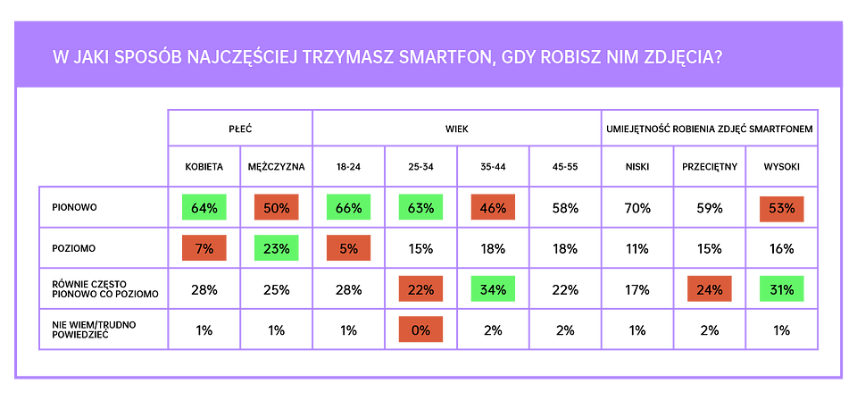 - Ponad połowa badanych (57 proc.) podczas robienia zdjęć smartfonem zazwyczaj trzyma urządzenie w orientacji pionowej