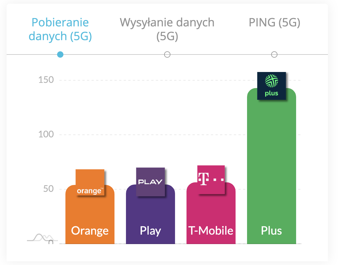 Bezapelacyjnie Plus nie miał w 2023 równych jeżeli chodzi o szybkość pobierania danych przy użyciu 5G. Jego wynik 142,9 Mb/s wprost deklasuje pozostałych rywali. Najwyższy wynik lider kategorii pobierania danych 5G osiągnął w styczniu (151,8 Mb/s), natomiast najniższe osiągnięcia zaraportowane zostały we wrześniu (136,2 Mb/s).