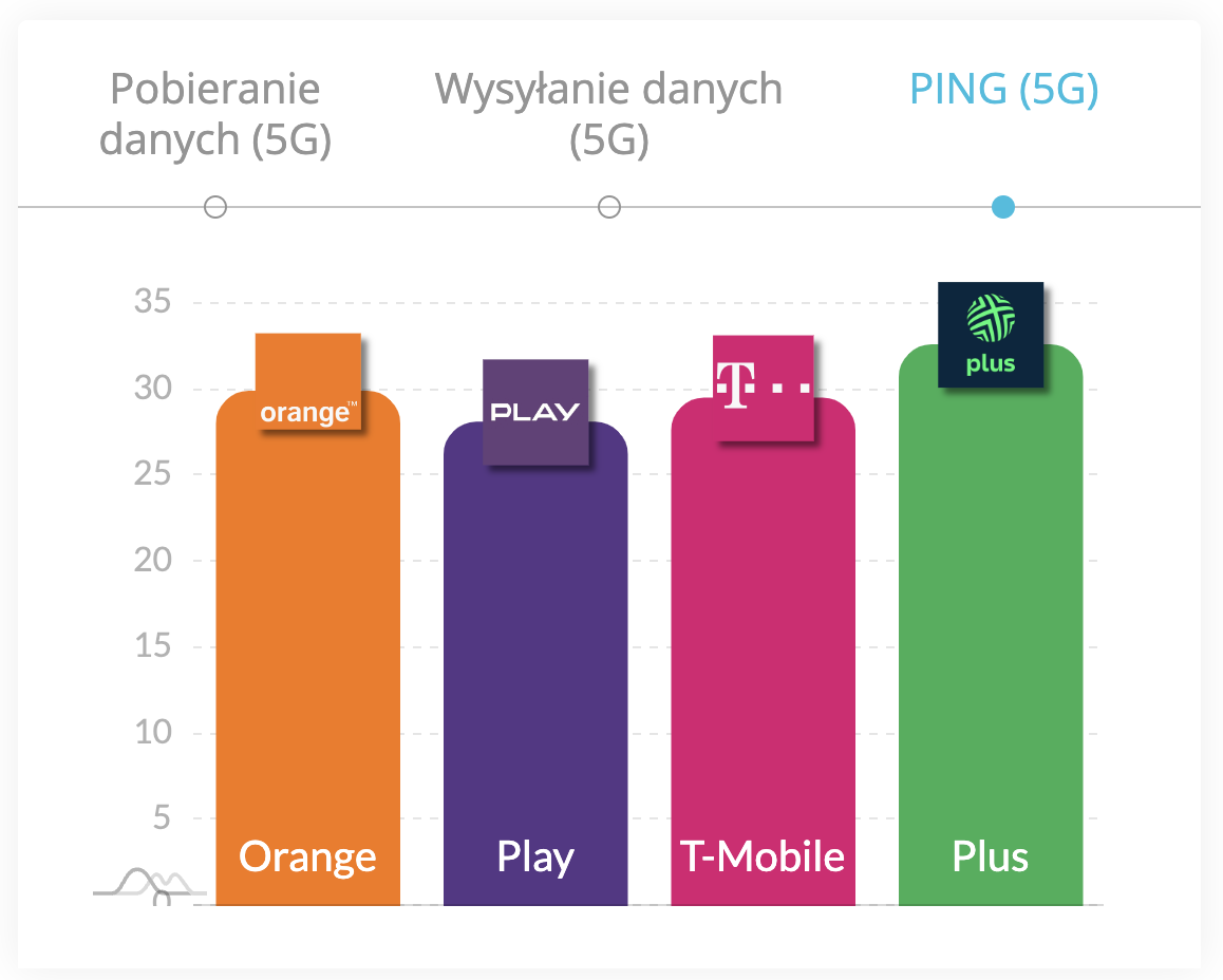 W zestawieniu najniższej średniej wartości ping, który jest istotny dla aplikacji takich jak gry online czy wideokonferencje, Play wyróżnił się najlepszym wynikiem wynoszącym 28,1 ms. Zaraz za nim uplasował się T-Mobile z wynikiem 29,5 ms, co świadczy o tym, że oba te podmioty zapewniają swoim użytkownikom szybkie i efektywne połączenia. Orange, osiągając 29,9 ms, oraz Plus z czasem 32,6 ms, znajdują się na dalszych pozycjach, lecz ich wyniki wciąż pozostają w zakresie akceptowalnym dla większości zastosowań.