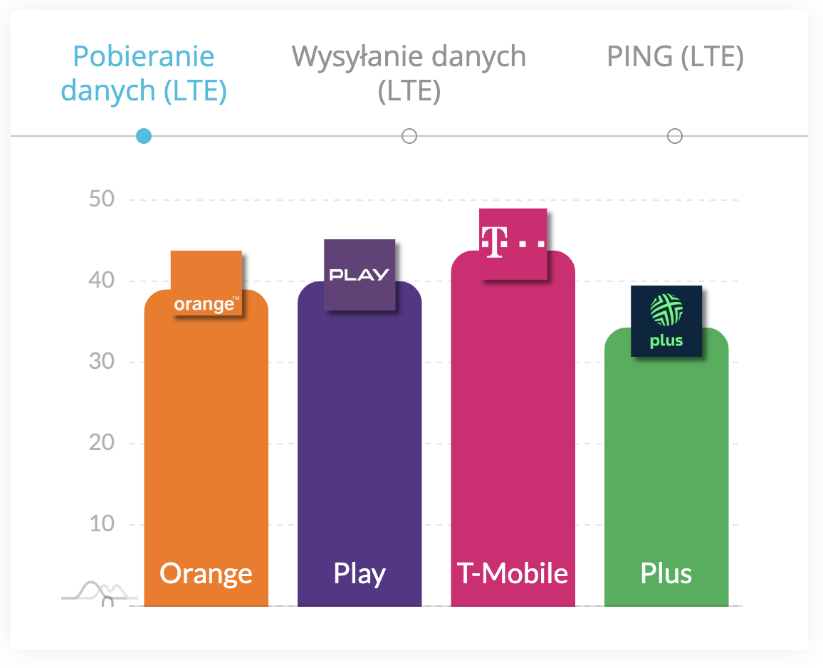 Drugie miejsce jest bardziej zatłoczone. Tutaj Orange i T-Mobile walczą zaciekle osiągając zbliżone rezultaty. Ostatecznie T-Mobile (20,1 Mb/s) prześcignął Orange (19,6 Mb/s), a Plus, z wynikiem 17,5 Mb/s, znajduje się na końcu stawki.