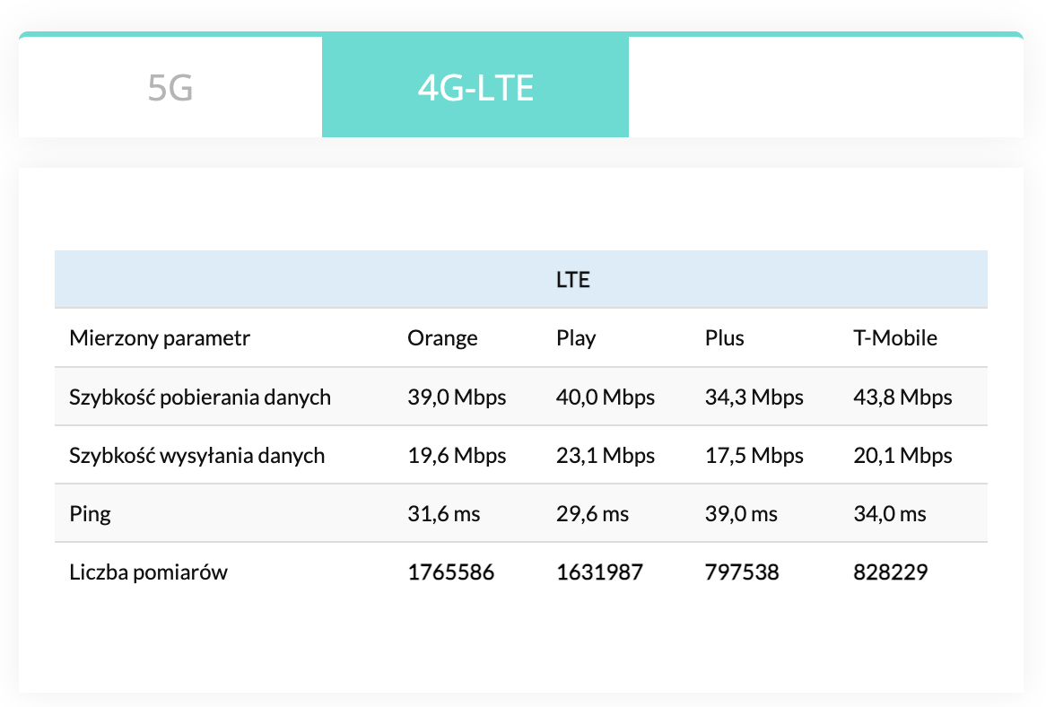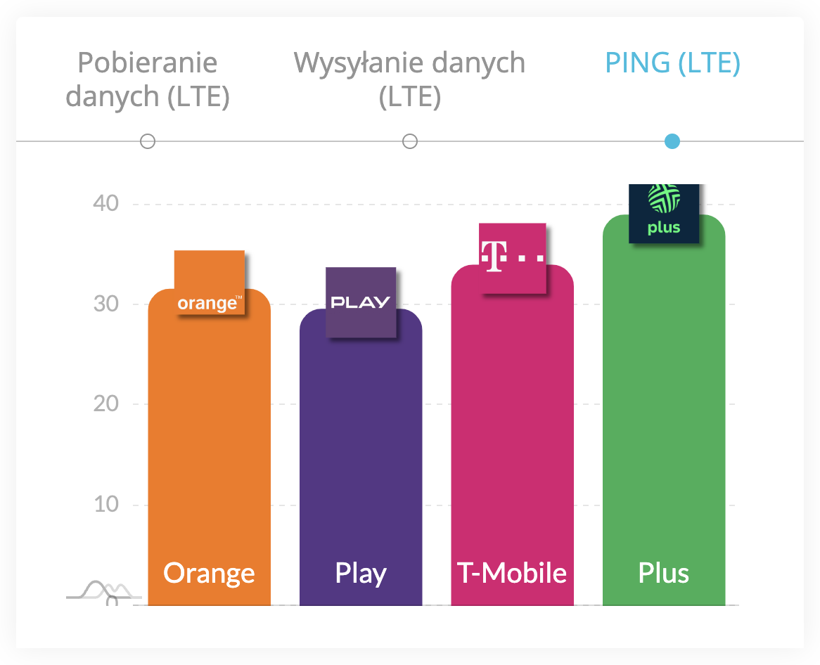 Tak jak w poprzednim segmencie, również w kategorii ping LTE to Play wyłonił się jako zwycięzca naszego rocznego podsumowania. Z wynikiem 29,6 ms, zajął on zasłużenie pierwszą pozycję, wyprzedzając Orange z czasem 31,6 ms, a także inne firmy telekomunikacyjne – T-Mobile z wynikiem 34 ms i Plus, który osiągnął 39 ms.
