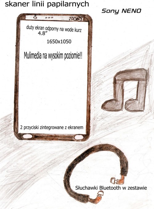 A to wszystko na panoramicznym wyświetlaczu 4.8” 16mln. kolorów w technologii pic odporny na uderzenia!! Mimo to zapewnia wyśmienitą jakość barw również w słońcu. Z takim ekranem możesz naprawdę wiele i do tego rozdzielczość 1650×1050. Przyciski pod ekranem to jego część możesz wyświetlić na nich skrót do czego tylko ze chcesz Zapomnij o komputerze. NENO nie boi się wody kurzu piasku i upadku z wysokości 2m. Myślisz że jest brzydki…. O Nie!!! Zamknięty w piękniej stylowej obudowie . Spójrz na zdjęcia. Dwu kolorowa obudowa i stylowe wytrzymałe materiały do niedawna używane w lotnictwie i technologiach kosmicznych. Podsumowując Sony NENO to super telefon … czytelny ekran to jest to!! Do tego super jakość muzyki oraz dołączone stylowe słuchawki Bluetooth zapewniają mobilność na wysokim poziomie. Absolutny MUST-HAVE!!