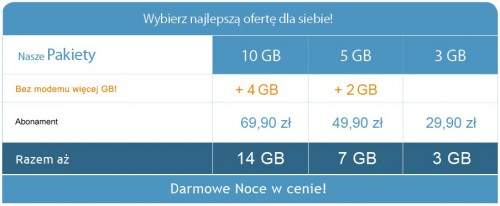Użytkownicy mają do wyboru trzy pakiety danych, dostosowane do ich różnych potrzeb. Rezygnując z zakupu modemu w promocyjnej cenie, klient otrzymuje powiększony pakiet danych w cenie pakietu podstawowego.