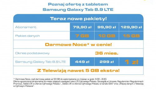 W aktualnej promocji Samsung Galaxy Tab 8.9 LTE z Internetem Cyfrowego Polsatu można kupić nie tylko w przystępnej cenie, ale także z wybranym pakietem danych, dostosowanym do potrzeb użytkownika. Teraz operator oferuje trzy pakiety danych – 7 GB, 10 i 15 GB – a opłaty miesięczne zaczynają się od 79,90 zł.
