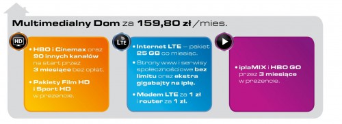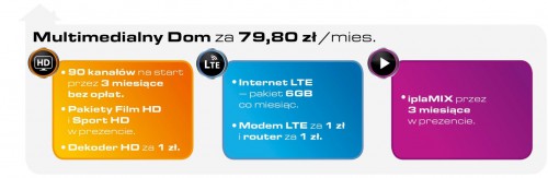 Już za 79,80 zł miesięcznie można cieszyć się jednym z optymalnych zestawów, który zapewnia: rozrywkę telewizyjną z dodatkowymi pakietami Film HD i Sport HD w prezencie oraz dekoderem HD już za 1zł, internetowy pakiet danych wraz z nowoczesnymi urządzeniami oraz 3-miesięczny dostęp do pakietu iplaMix, dzięki któremu klienci mają możliwość poznać bez zobowiązań zalety i różnorodność ipli – największej polskiej telewizji internetowej.