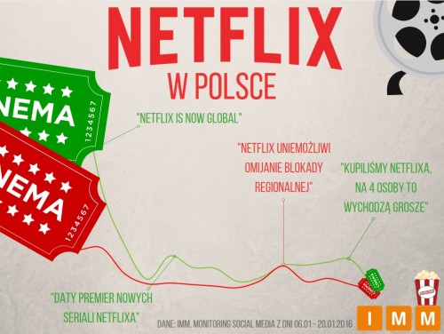 „Netflix w Polsce!” – słowa te internauci powtórzyli w styczniu blisko 10 tysięcy razy. Jak wynika z monitoringu social media w IMM, tylko dzięki serwisom społecznościowym, blogom i portalom internetowym informacja o wejściu giganta VOD do Polski trafiła do ponad 15 mln osób. I choć po pierwszej fali entuzjazmu emocje nieco opadły, to nadal większość polskich internautów pozytywnie wypowiada się o Netfliksie.
