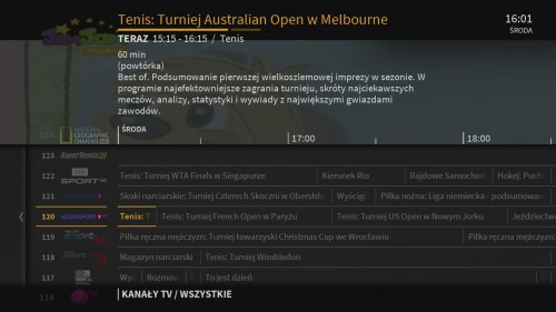 EVOBOX PVR cechuje bardzo intuicyjne i przejrzyste menu, a to sprawia, że poruszanie po nim jest płynne. Moim zdaniem, nawet laikowi technologicznemu wystarczy kilka minut, by go opanować. Ja nauczyłem się go praktycznie po jego jednorazowym przejrzeniu. Pozwala ono na zaawansowane wyszukiwanie i filtrowanie programów (np. po kategorii tematycznej, tytule, czasie emisji itp.), posiada bardzo czytelny przewodnik po programach w dwóch wersjach (w widoku tabeli i listy), a także umożliwia ustawianie przypomnień oraz zapoznanie się z polecanymi programami (np. z listy EPG, Hity HBO GO czy Nowości VOD). Jeżeli naciśniemy przycisk INFO, to otworzy się nam okno ze szczegółowym opisem aktualnie nadawanego programu. Dodatkowo dekoder ma możliwość wykonania automatycznej aktualizacji oprogramowania bezpośrednio przez Internet.
