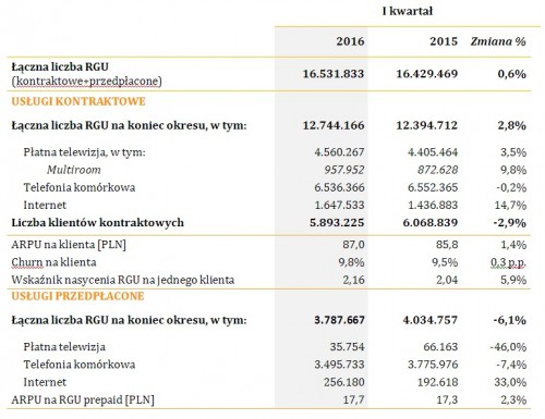 - Łączna liczba usług kontraktowych wzrosła w I kwartale o 129 tys. do 12,7 mln, a przychód od jednego klienta wzrósł do 87 zł w ujęciu rok do roku.