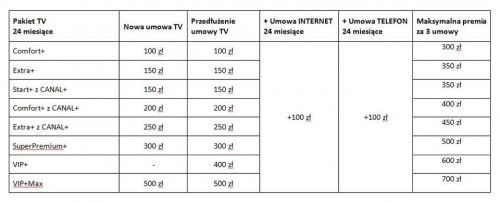 Warunkiem skorzystania z promocji „Extrakasa” przez Klientów przedłużających umowy na usługi telewizyjne jest zmiana pakietu na wyższy lub utrzymanie tego samego pakietu (dotyczy ofert nieprzecenionych).