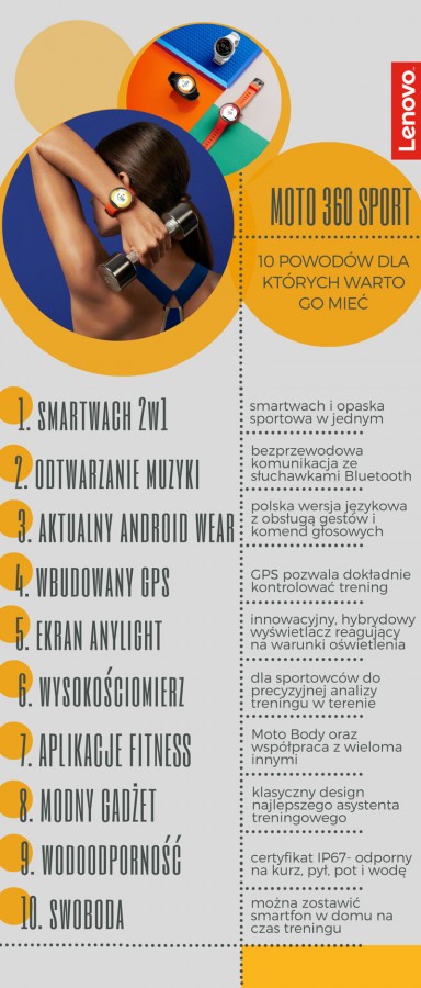 Lenovo Moto 360 Sport to rozwiązanie dla wszystkich aktywnych osób, które nie chcą zabierać ze sobą na trening smartfona, a muszą cały czas trzymać rękę na pulsie. To tak naprawdę dwa w pełni funkcjonalne urządzenia zamknięte w jednej obudowie. W tym przypadku mniej znaczy więcej – przede wszystkim wygody.