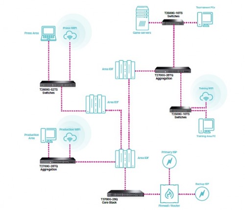 Podstawą sukcesu e-sportowych rozgrywek na masową skalę jest sprawne wdrożenie sieci przewodowej i WiFi, która będzie w stanie spełnić wymagania wszystkich uczestników imprezy: od graczy, widzów, personelu i ekipy produkcyjnej, aż po obecnych na miejscu dziennikarzy, którzy potrzebują na bieżąco komunikować się z czytelnikami, oraz partnerów wydarzenia. Im większa impreza, tym bardziej złożona infrastruktura sieci i większe wymagania co do jej przepustowości. Organizatorzy muszą dołożyć wszelkich starań, aby uniknąć związanych z nią problemów. Dysponując nowoczesną infrastrukturą miedzianą i światłowodową w nowszych obiektach, można znacznie przyspieszyć wdrożenie sieci. Jednak, aby w pełni wykorzystać jej możliwości, przełączniki muszą być w stanie obsłużyć oba rodzaje połączeń, tak aby zapewnić maksymalną przepustowość.
