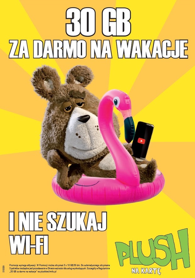 Promocja „30 GB na wakacje za darmo” obowiązuje od 10 czerwca do 10 września 2019 r, a więcej informacji można znaleźć na www.plushbezlimitu.pl.
