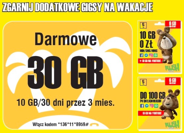 „30 GB na wakacje za darmo” to propozycja dla klientów taryfy Nowy Plush, w której można dostać bezpłatnie trzy pakiety po 10 GB, przyznawane automatycznie po sobie co 30 dni. By z niej skorzystać wystarczy tylko: