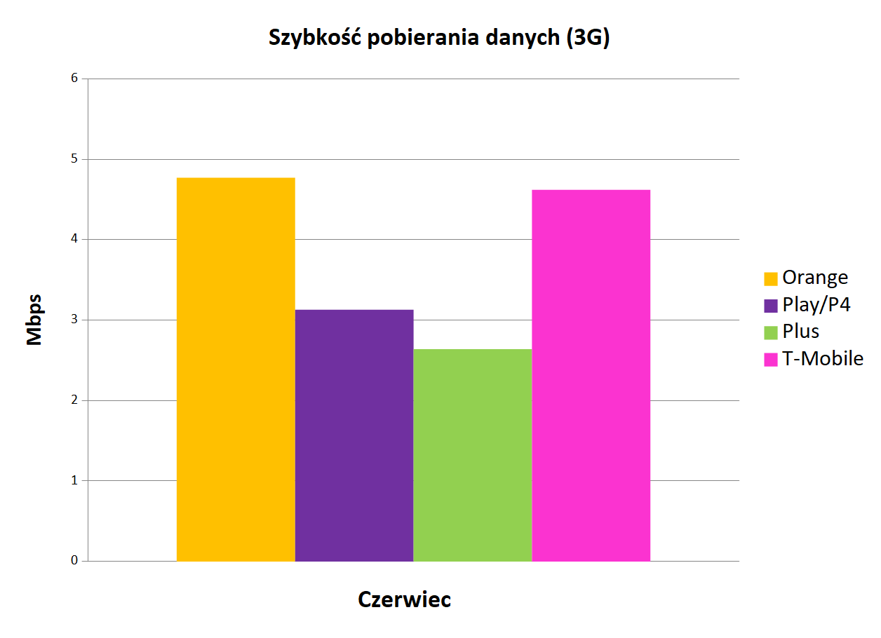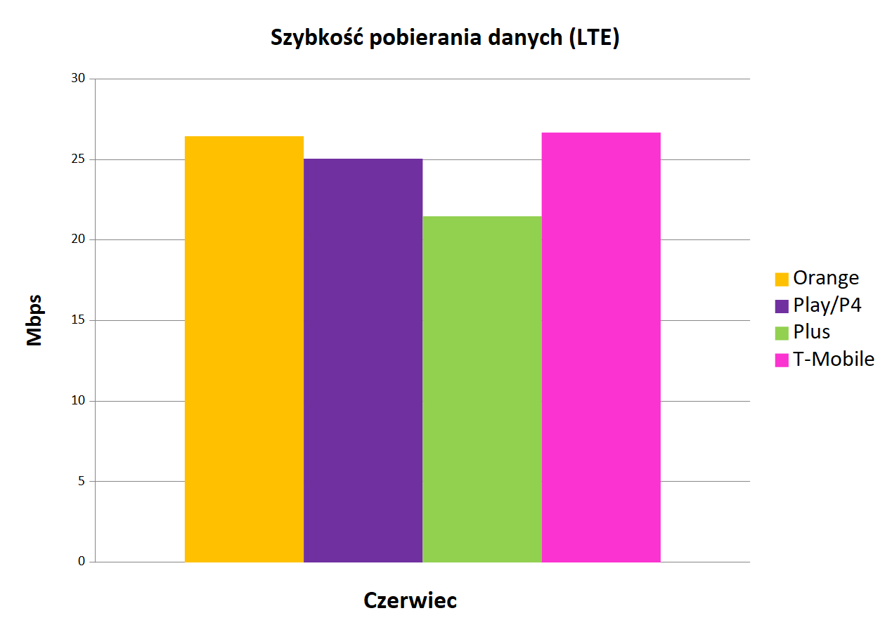T-Mobile utrzymał pozycję lidera w kategorii średniej szybkości pobierania danych. Operatorowi udało się to dzięki osiągnięciu wyniku 26,67 Mb/s. Warto zauważyć, że poprawił on swój poprzedni wynik. Na drugiej pozycji znalazł się Orange z niewiele gorszym wynikiem 26,44 Mb/s. Play nieznacznie oddalił się od pierwszych dwóch miejsc w tabeli, ponieważ czerwiec przyniósł temu operatorowi wynik 25,05 Mb/s. Listę po raz kolejny zamknął Plus (21,48 Mb/s).