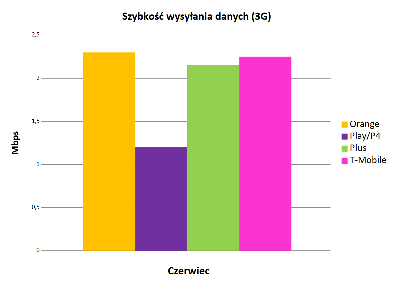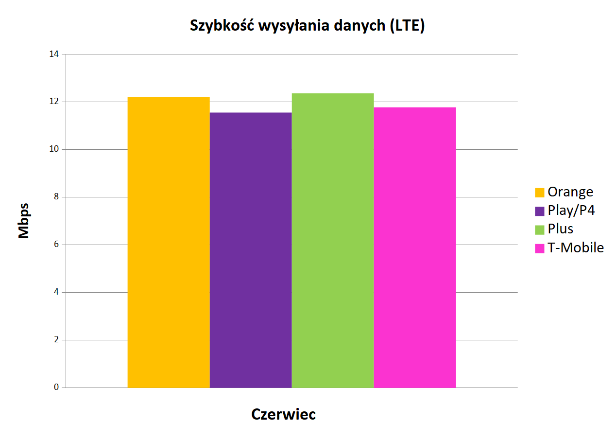 Po dziesięciu miesiącach nastąpiła zmiana lidera w kategorii średniej szybkości wysyłania danych. Orange oddał tytuł Plusowi, który z trzeciego, awansował na pierwsze miejsce. Wszystko dzięki osiągnięciu w czerwcowych pomiarach wyniku 12,37 Mb/s. Dotychczasowy lider uzyskał wynik niewiele słabszy i po raz drugi w tym miesiącu przegrał rywalizacji o ułamki. Potwierdza to zbliżony do Plusa wynik 12,22 Mb/s. W dalszej części tabeli nastąpiły kolejne zmiany. T-Mobile z czwartego miejsca awansował na trzecie, dzięki rezultatowi 11,78 Mb/s. Najsłabiej tym razem wypadł Play, który zamknął notowanie wynikiem 11,56 Mb/s.